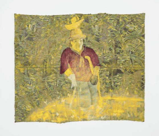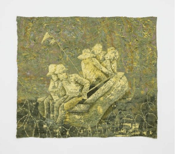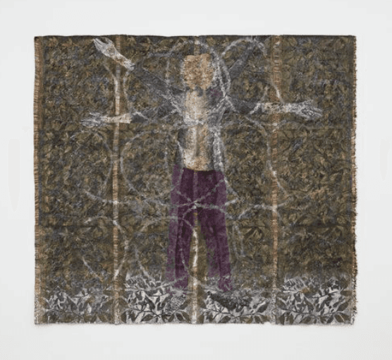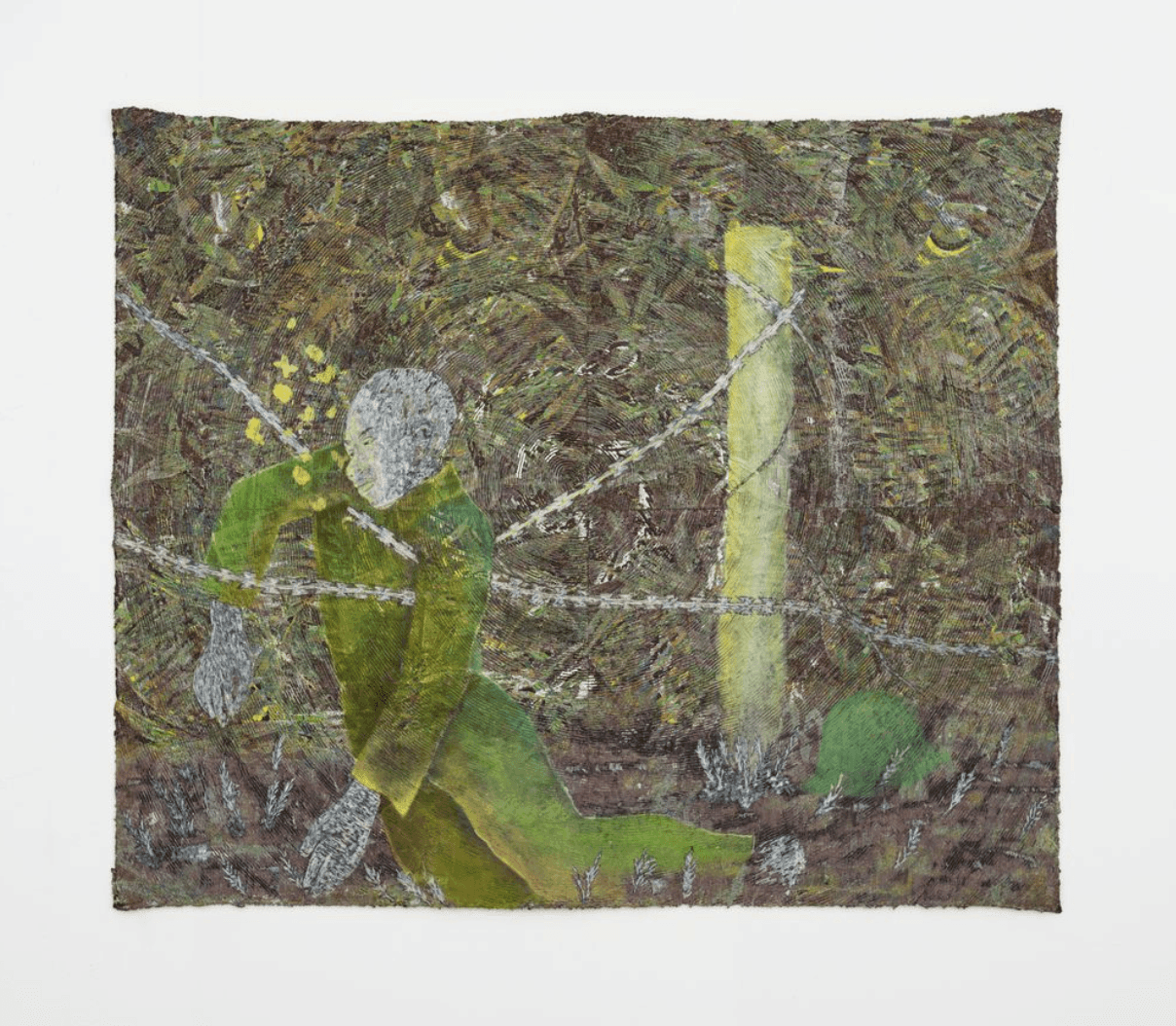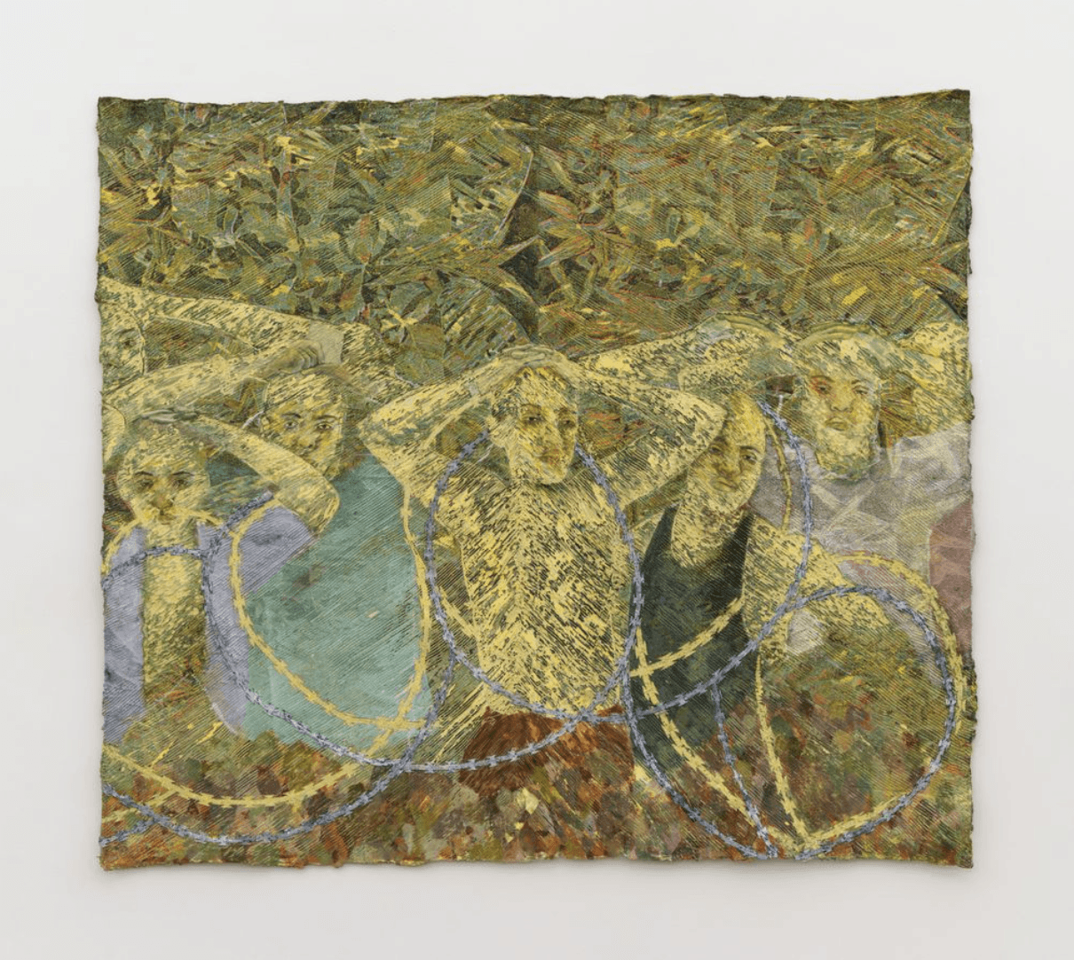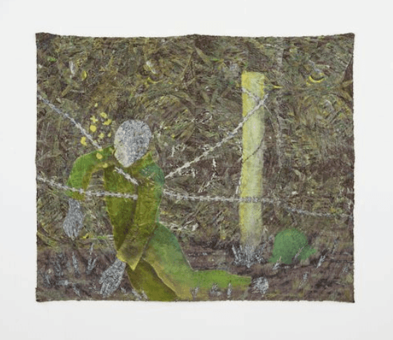 Acrylic and oil relief on canvas, barbed wire, backed with muslin collage