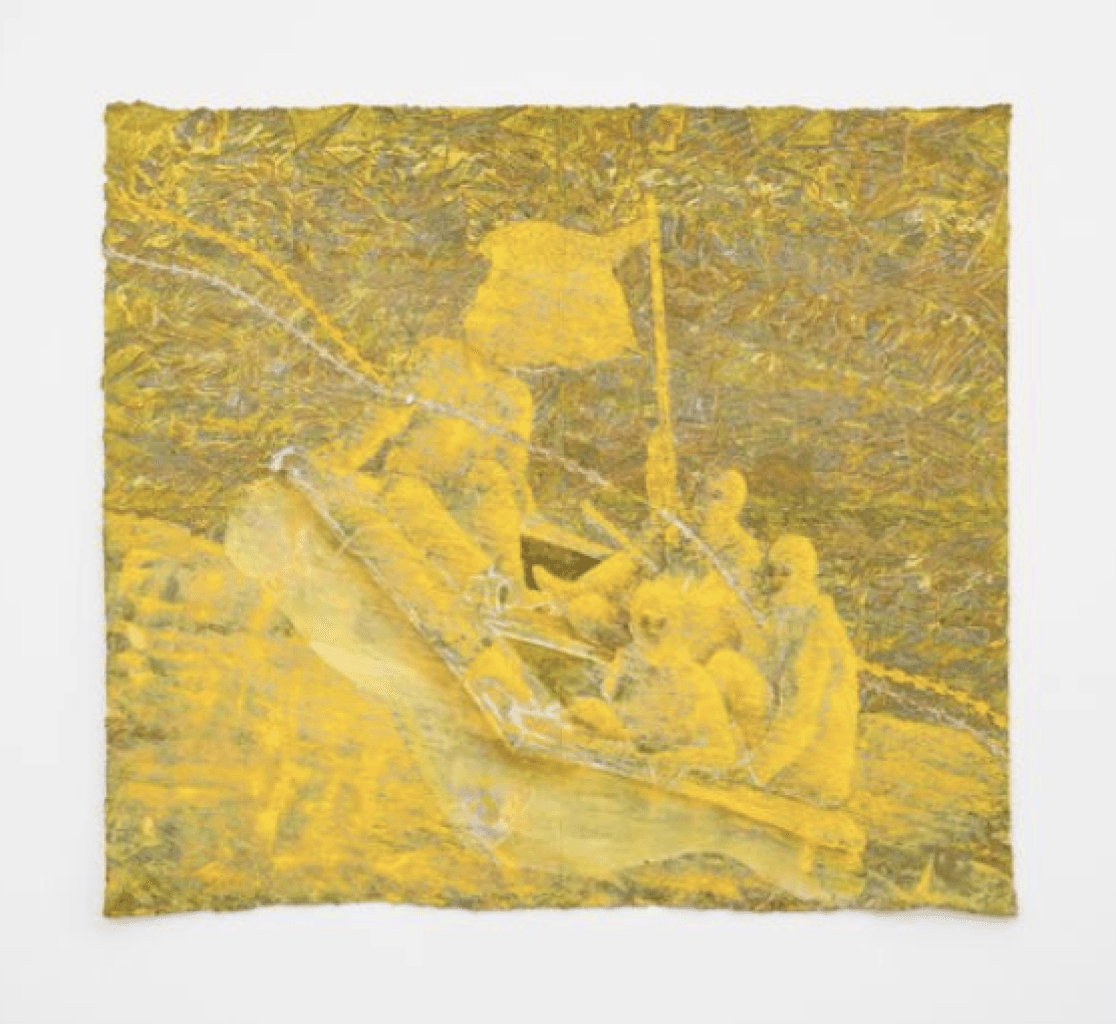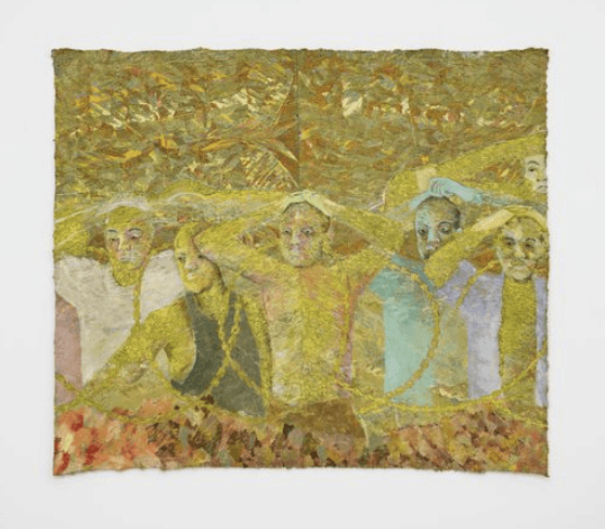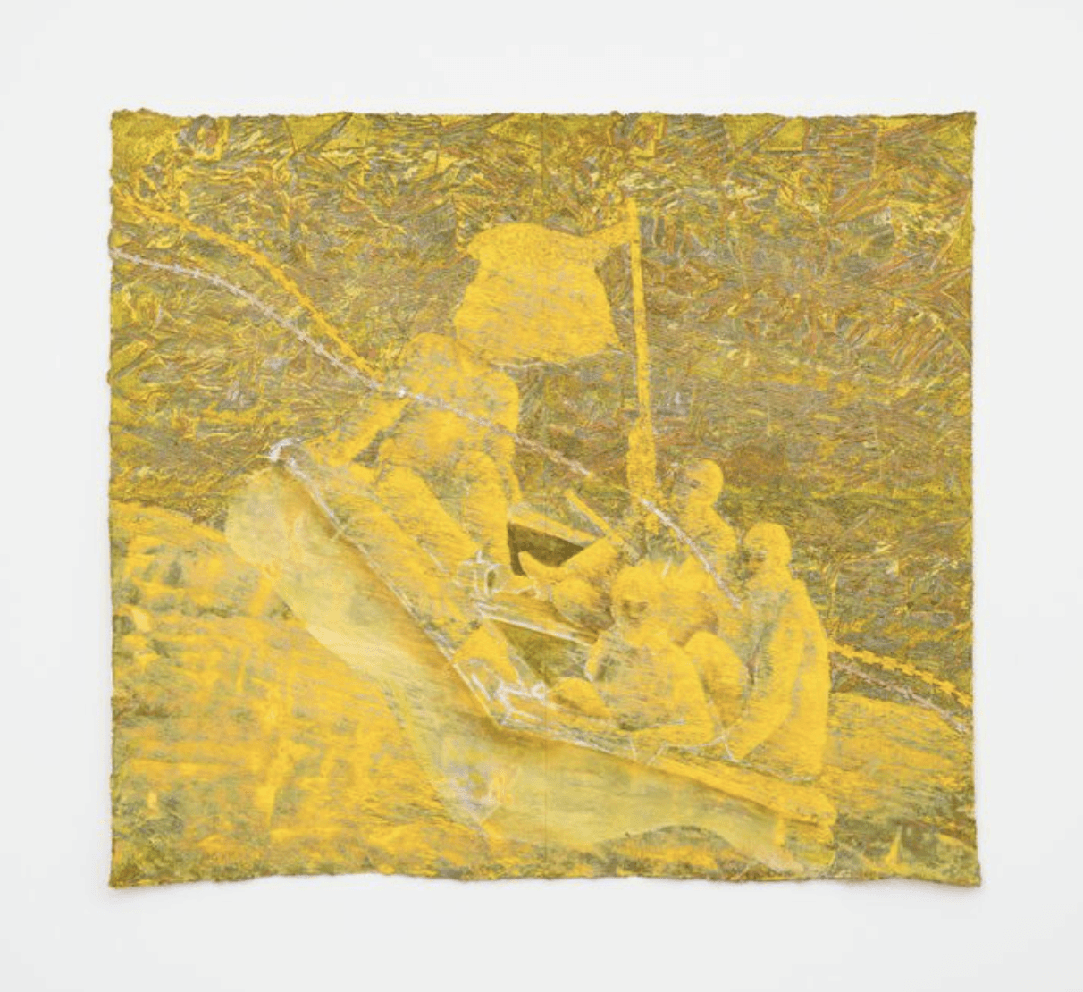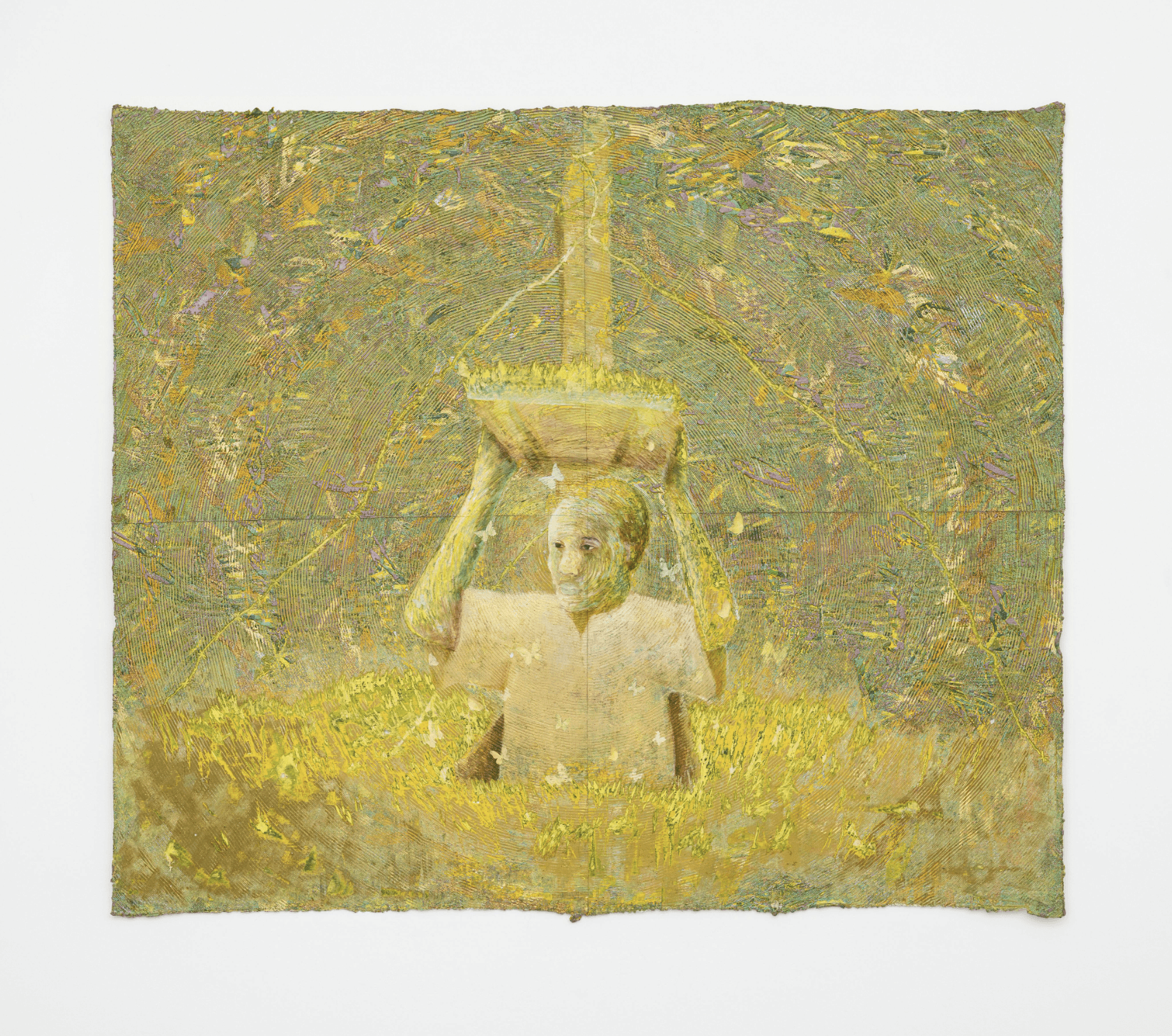 Kathia St. Hilaire, Head Whisper, 2022, oil based relief, collage, paper, metal, thread. Courtesy of the artist