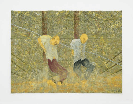 Acrylic and oil relief on canvas backed with muslin collage and woven with steel and skin
